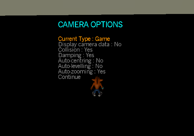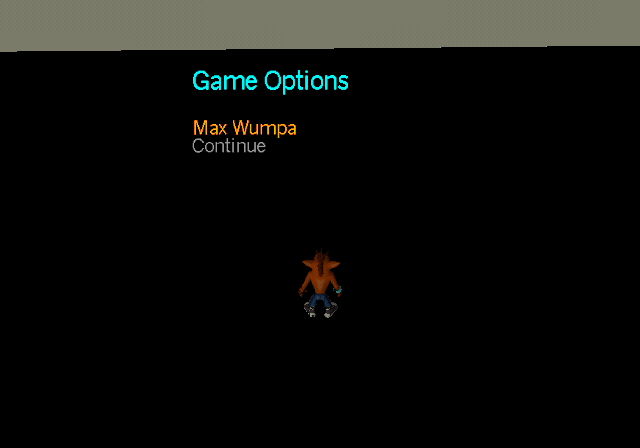 - Game Options (contains the option Max Wumpa which gives 100 Wumpa to the player)