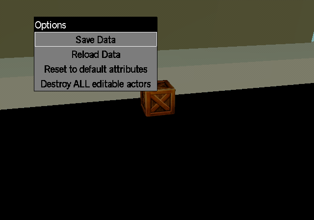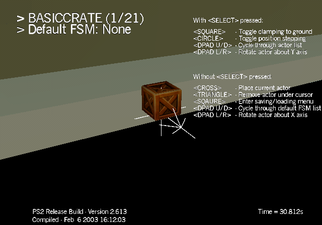 - Square - enters menu that offers saving to file, reloading from file, resetting and destroying all instances spawned using the editor