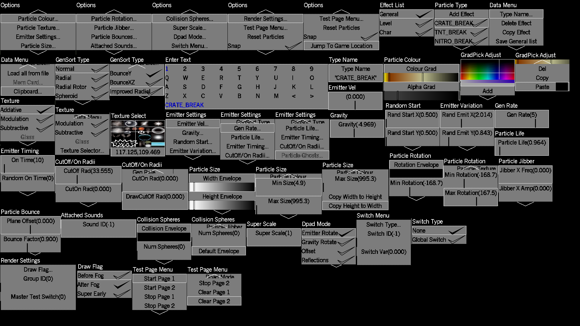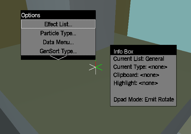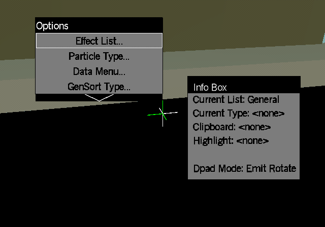 - Square - enters menu with extensive settings to create, save and load particle effects and instances.